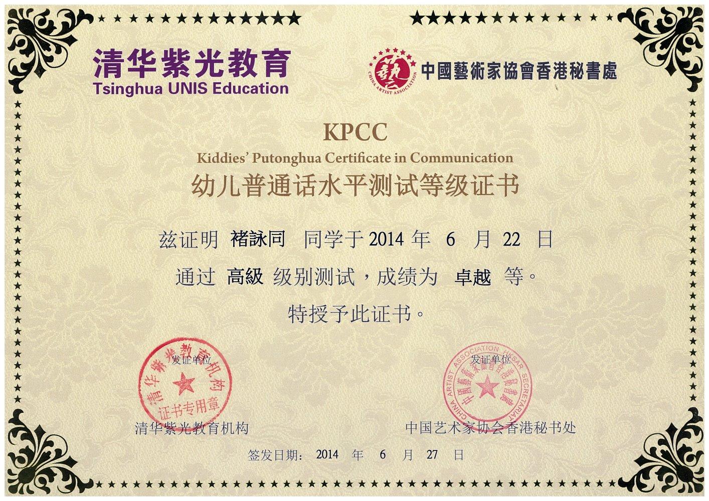 KPCC幼兒普通話水平測試等級証書
